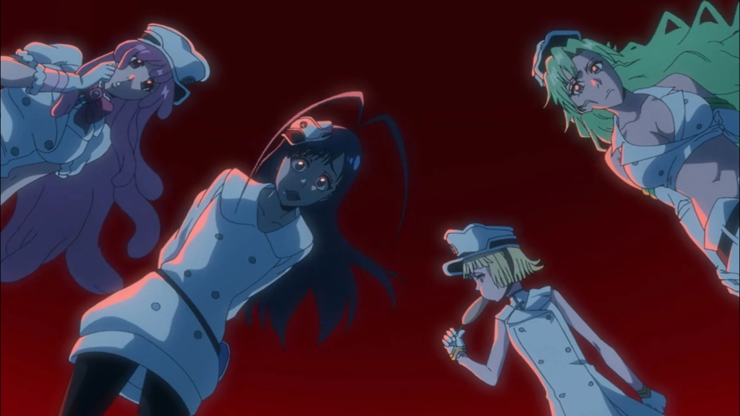 Meninas est la première à attaquer Ichigo avec Dumbbell Duster, des haltères faites d’énergie spirituelle. Transformant ses haltères en bâton, elle est alors interrompue par Liltotto. Celle-ci envoie une mâchoire d’énergie spirituelle et des pointes, qui font reculer le Shinigami. Attendant l’occasion pour l’attaquer par derrière, Giselle créé des pantins faits d’énergie spirituelle, Dancing Dead Boys Club, et les envoie foncer sur Ichigo. Ce dernier les brise sans difficulté mais les os paralysent alors le Shinigami. Giselle profite de cette ouverture pour l’attaquer avec Munchy Munchy Babies, tandis que Liltotto l’attaque en même temps avec deux gigantesques mâchoires, Golden Crunch, qui engloutit Ichigo et Giselle. Le Shinigami parvient tout de même à stopper les deux attaques, mais voyant que Meninas lui fonce dessus avec une grande hache, il esquive cette dernière.