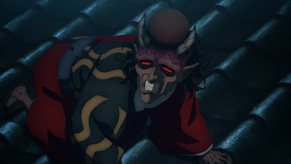 Cependant, leurs victimes potentielles se rétablissent rapidement, mais sont de nouveau assommées par une décharge d'électricité de Sekido. Urogi s'approche pour les attaquer, mais sa tentative est esquivée. Alors que les deux s'enfuient, Sekido réprimandae Karaku pour sa lenteur, lui demandant de raser tout le bâtiment, ce que le démon fait rapidement. Il remarque alors que les deux n'ont plus d'endroit où se cacher. Voyant Tanjiro avec une lame en feu, Urogi ne se laisse pas intimider et charge pour attaquer l'épéiste sous les yeux de Sekido et Karaku. Cependant, Sekido se rend compte que la lame du garçon est identique à celle de l'épéiste des souvenirs de Muzan, à tel point que leurs visages semblent se superposer. Tanjiro déclenche alors Danse du Dieu du Feu : Halo Solaire Danse Draconique, infligeant de graves blessures à chacun des trois Démons de l'émotion. Un peu plus loin, Genya avait réussi à blesser gravement Aizetsu, le plaquant contre un arbre avec son propre yari et lui arrachant la tête.