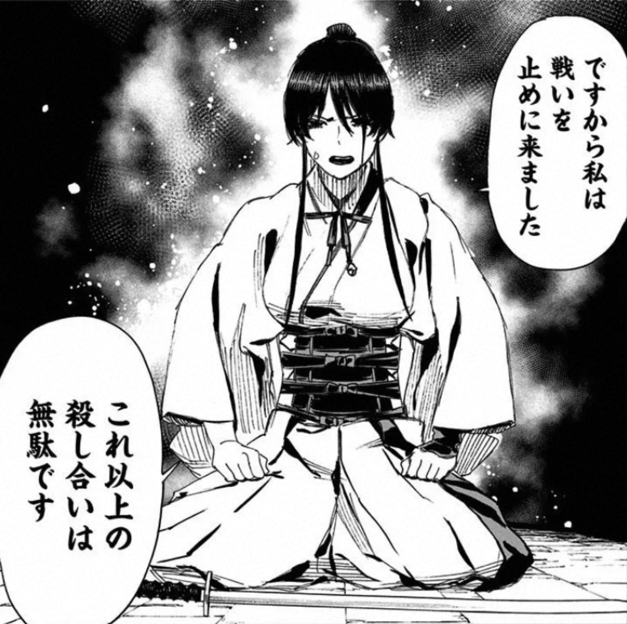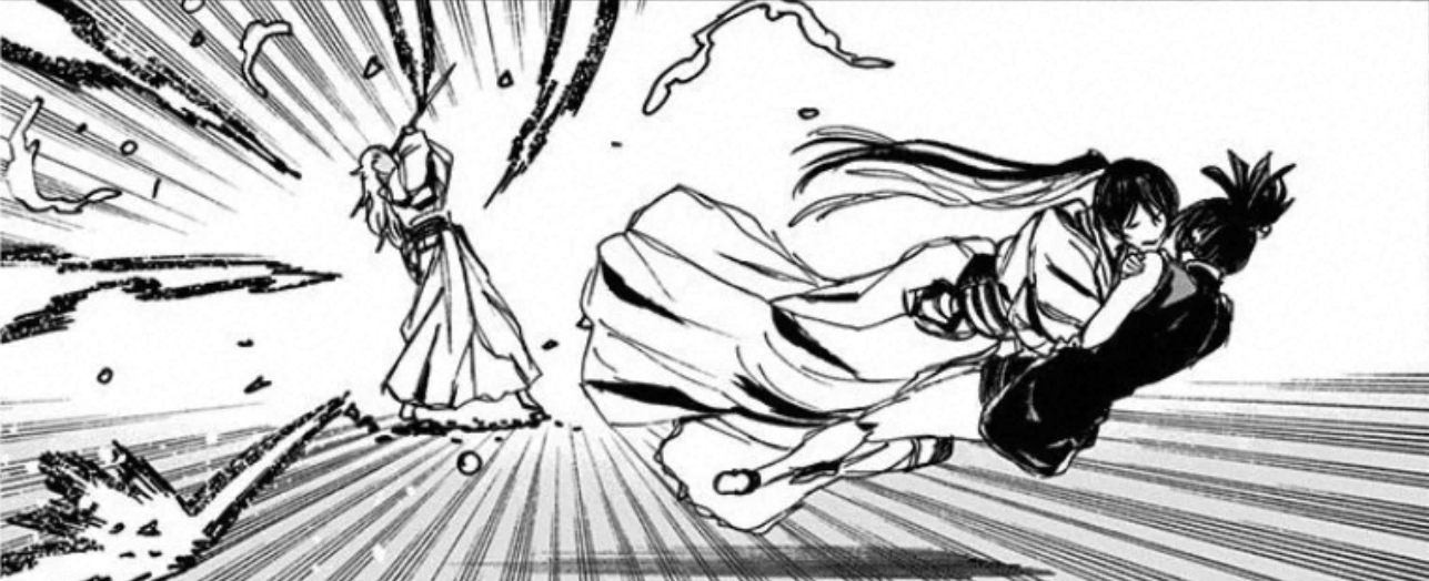 Genji voit Rokurōta sur le point d'attaquer et pousse Sagiri sur le chemin. Rokurōta envoie Genji s'écraser et Sagiri court à son aide, sans savoir que Rokurōta est sur le point d'attaquer. Heureusement, Gabimaru arrive et envoie le géant s'écraser d'un coup de pied. Sagiri se rend tristement compte qu'Eizen n'est pas avec lui, ce qui signifie qu'il a été tué. Gabimaru dit à Sagiri de se replier pour ne pas se mettre en danger. Sagiri déplace Genji vers un emplacement de sauvegarde pour soigner ses blessures. Genji lui dit que cela ne servait à rien et lui donne la permission de le laisser derrière, mais Sagiri refuse. Genji a trouvé déroutant la façon dont Sagiri a agi comme un homme plus tôt, mais agit maintenant comme une femme. Sagiri se fichait de savoir si elle jouait l'un ou l'autre tant qu'elle pouvait l'aider. En entendant ses paroles, Genji comprend enfin Sagiri et lui donne une de ses épées, faire confiance à Sagiri pour vaincre Rokurōta. Sagiri rejoint Gabimaru et parvient à couper l'un des doigts de Rokurōta. Les deux se demandent ensuite mutuellement leur aide au combat.