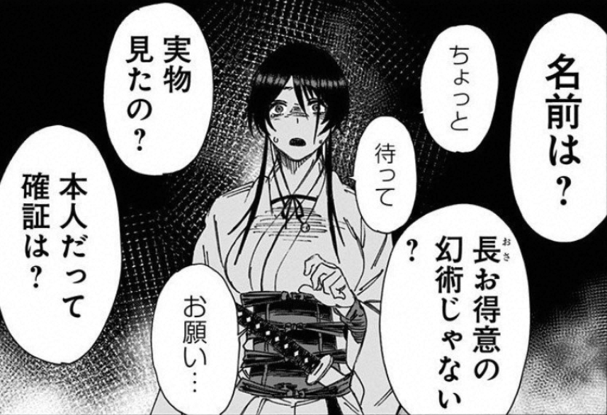 Sagiri et ses alliés entrent dans Hōrai et se réfugient dans l'une des colonies pour revoir ce qu'ils savent sur Tao. Après avoir évoqué l'élixir de vie et comment ils ne peuvent pas rentrer chez eux sans lui, Sagiri déclare que l'élixir doit exister parce que le chef du village de Gabimaru en a bénéficié. Cependant, Yuzuriha parle des possibilités pour le chef d'utiliser une illusion pour tromper les autres en leur faisant croire qu'il était immortel. Dans cet esprit, Yuzuriha discute de la théorie selon laquelle la femme de Gabimaru n'existe pas, ce qui fait peur à Sagiri alors qu'elle explique sa théorie.